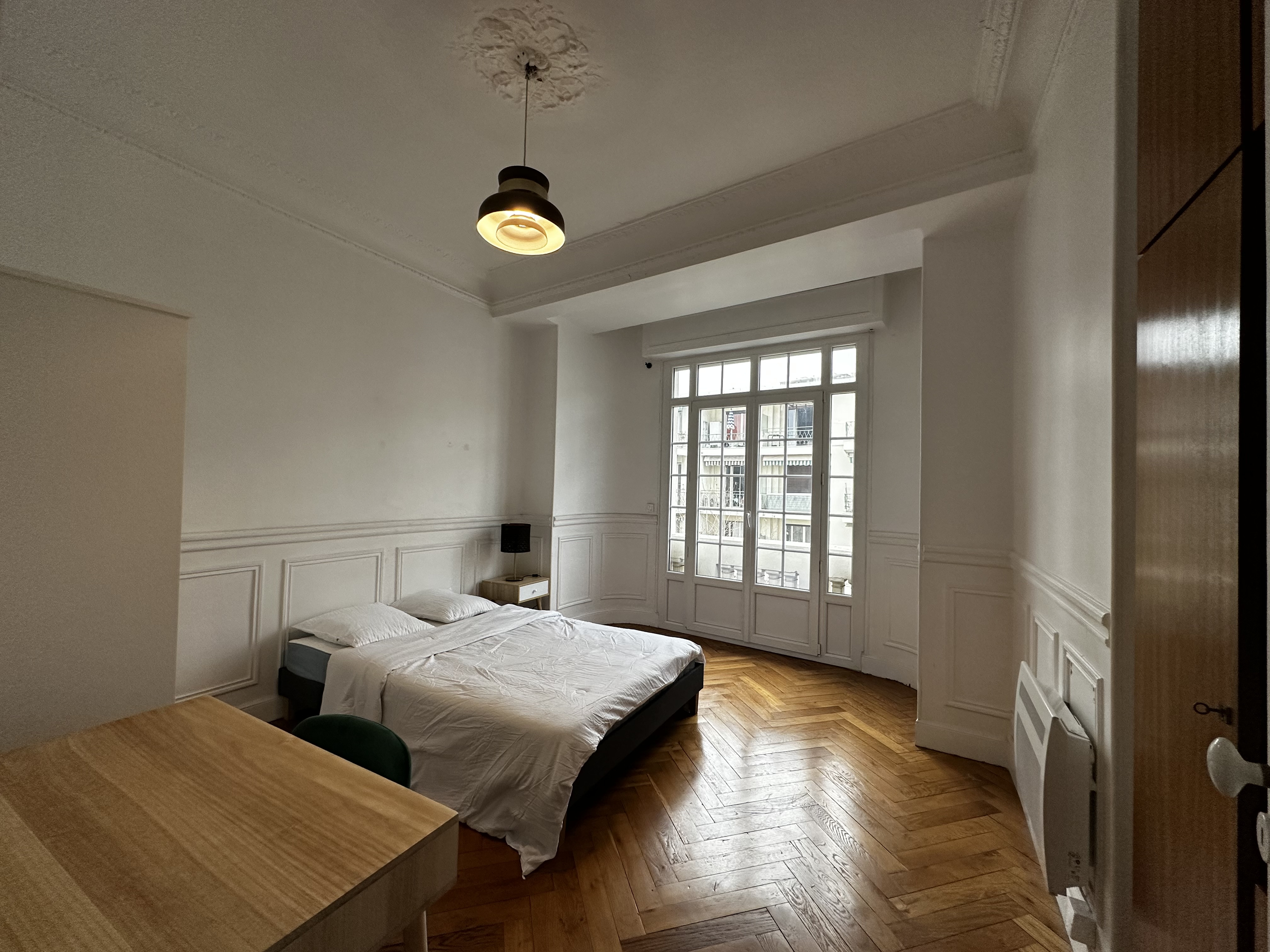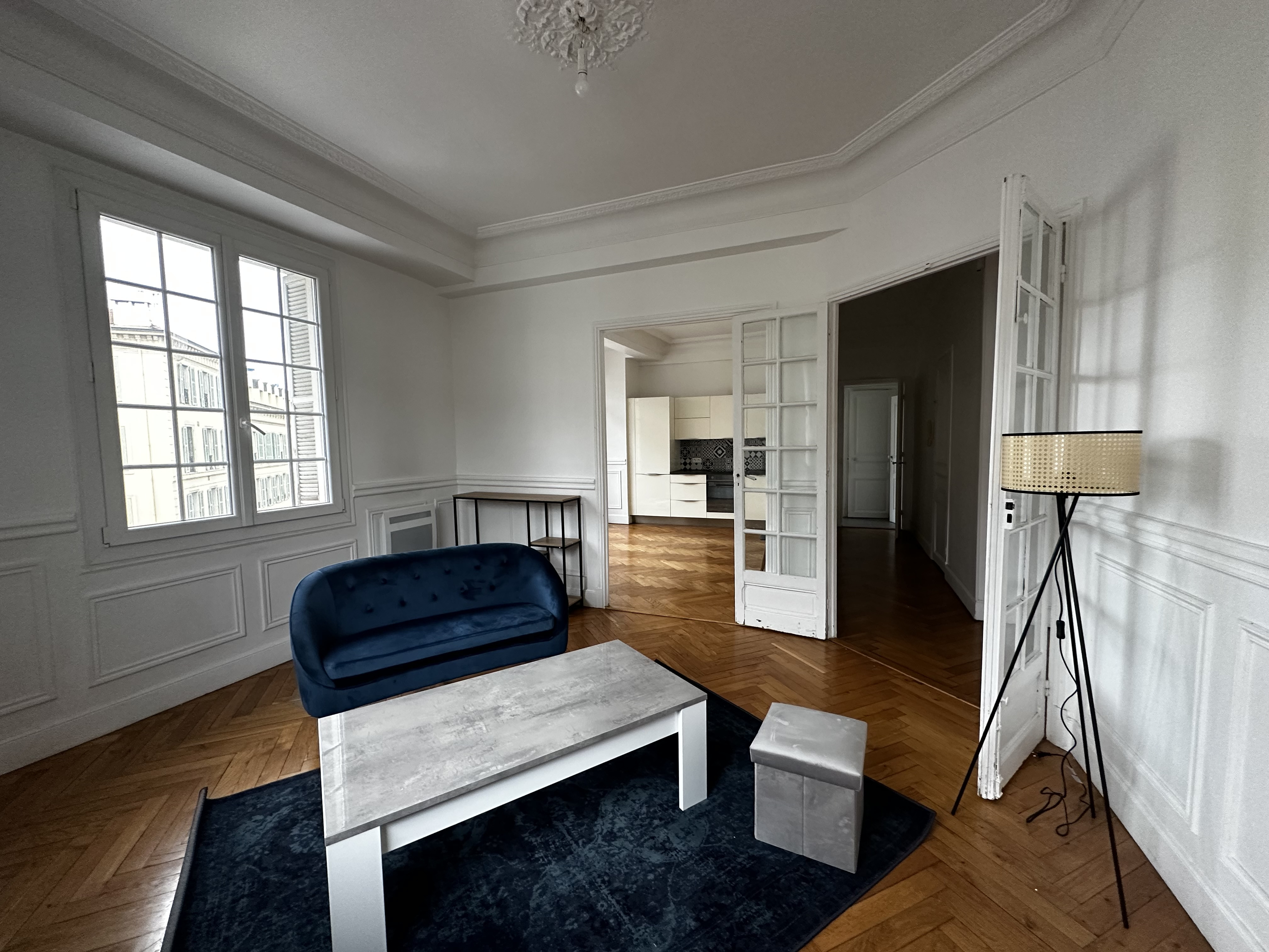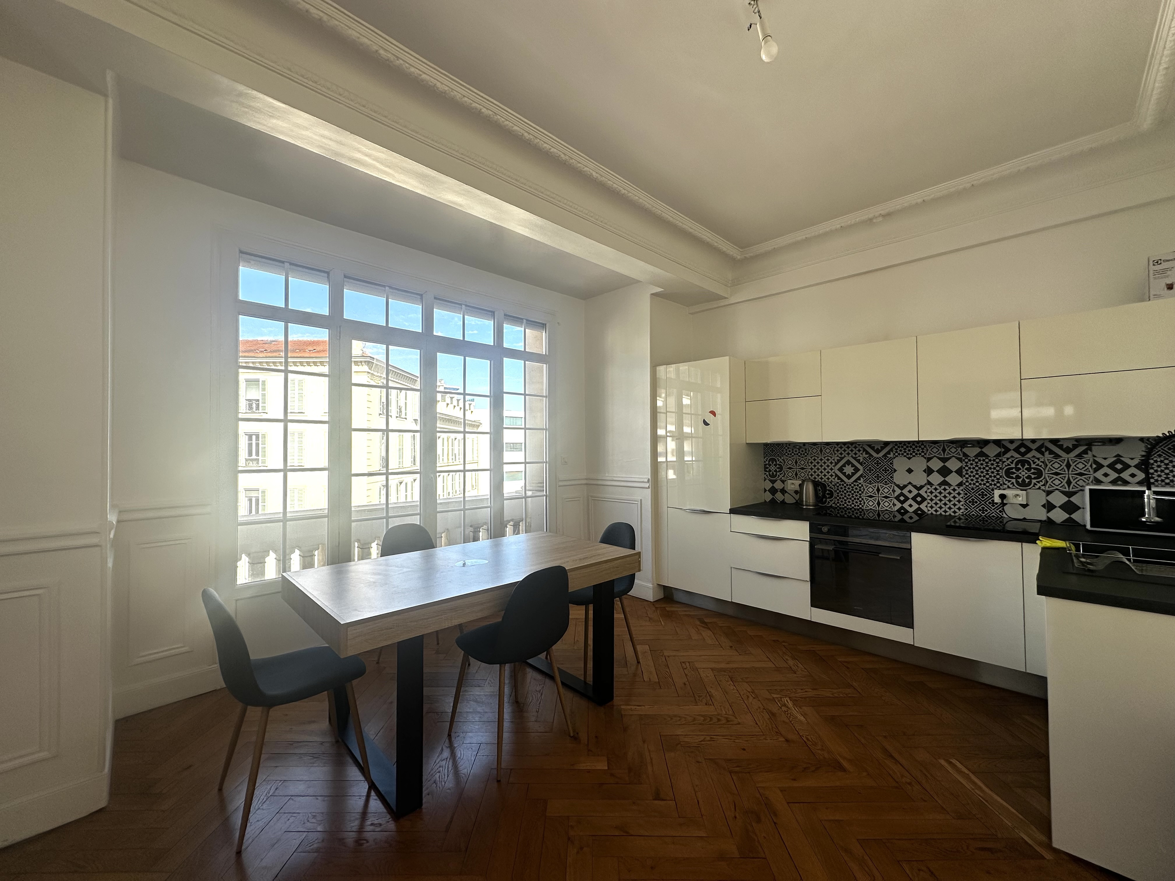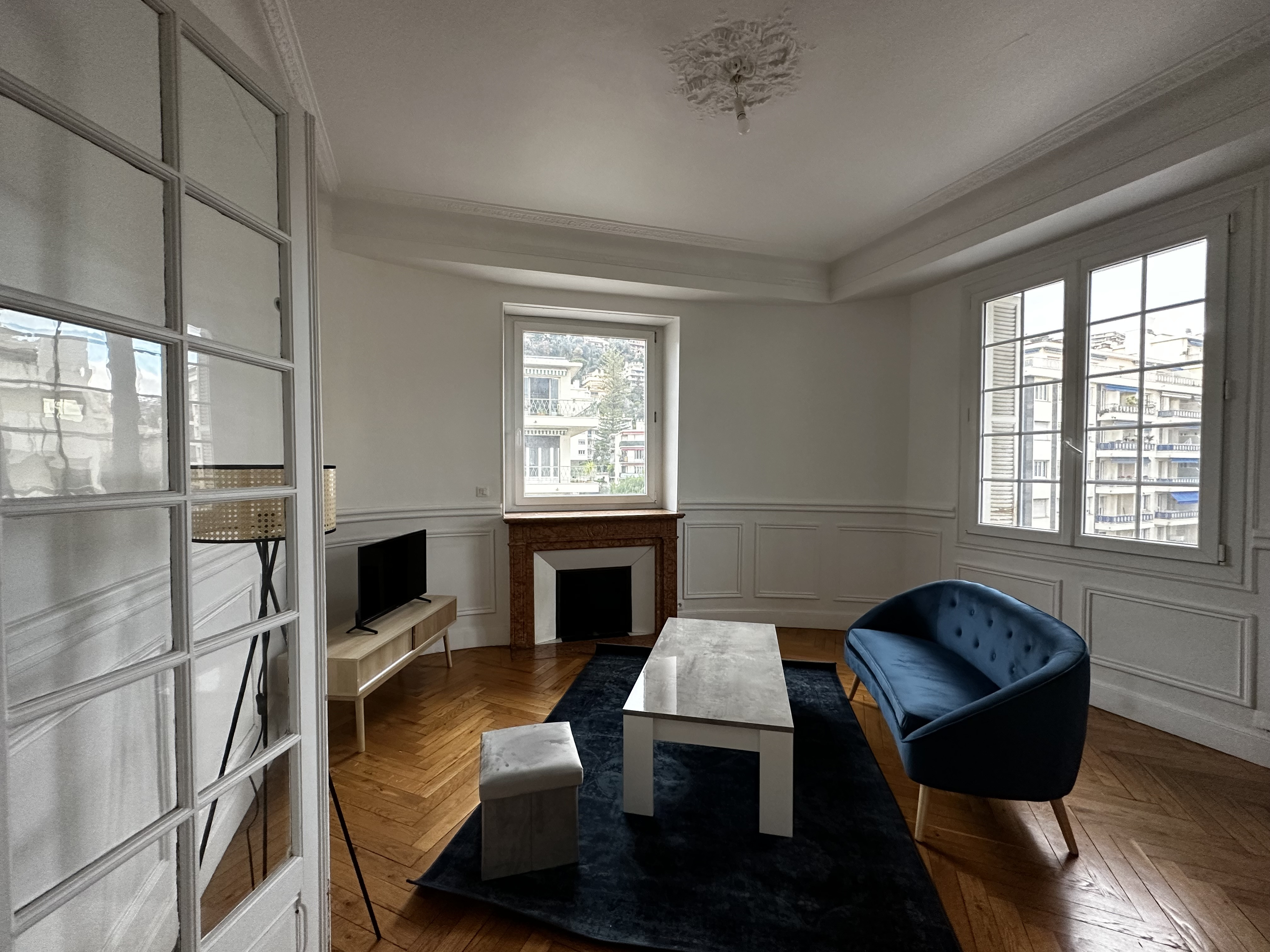 Nous vous proposons un très bel et spacieux appartement meublé en location longue durée à Nice. Superficie : 74,28m2. Le bien se situe au 4ème étage (avec ascenseur). Appartement joliment meublé, composé d'un grand et lumineux séjour ( télé, meuble télé, étagère, lampadaire, canapé, table basse ), d'une grande cuisine entièrement équipée (avec grand réfrigérateur, four, micro onde, lave-vaisselle, lave-linge, beaucoup de rangements ), grande table à manger, 4 chaises etc...,de deux chambres avec armoire, lit double et bureau, + salle de bain + WC séparé. L'appartement offre les équipements suivants : stores électriques, double vitrage, beau parquet en chevron, grande hauteur sous plafond et interphone.