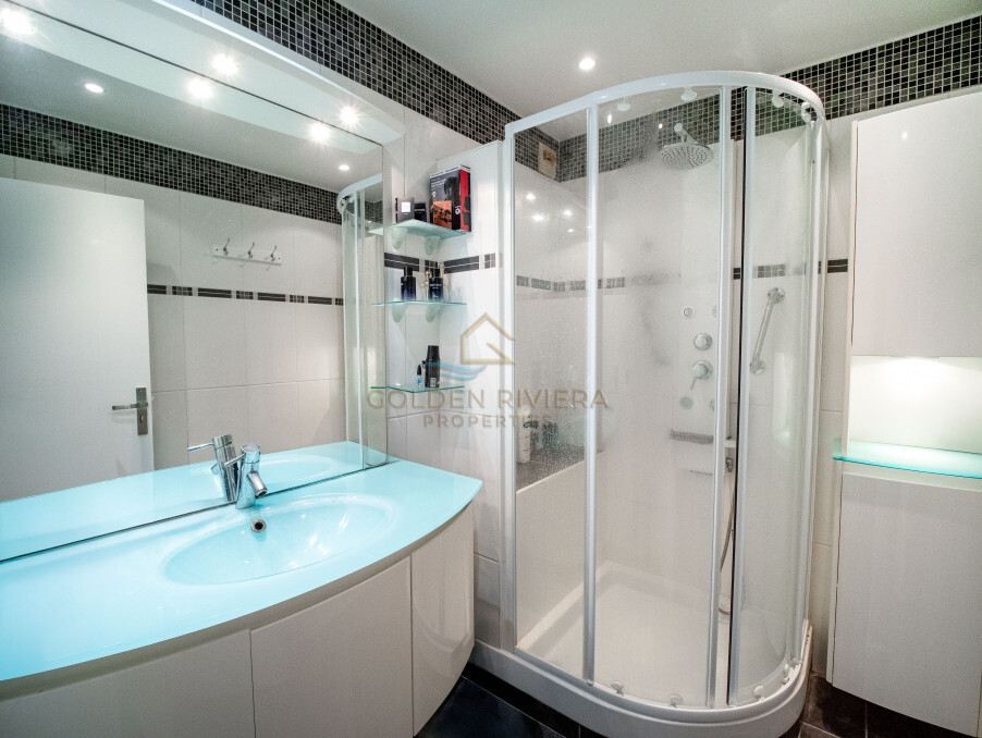 D'une superficie de plus de 100 m², il se compose d'une belle entrée menant à un spacieux séjour / salle à manger d'environ 30 m², ouvrant sur une grande terrasse ensoleillée avec vue mer et sur la piscine. La cuisine, indépendante, entièrement aménagée et équipée, donne accès à une seconde terrasse prolongée par un jardin privatif d'environ 40 m².